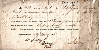 Billede: 1858. Datterens dåbsattest.