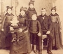 Fotoet viser fra venstre top: Mille, Gine, Anna. Siddende Mærregrethe Gregersen og Peder Jensen Brinck og Dorthea siddende hos tipoldemor. Stående forrest Mads Peder Brinck.